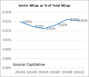 Sector’s share of total listed marketcap moved to 0.01% in October 2024 from 0.01% in September 2023 and 0.02% in September 2022.
